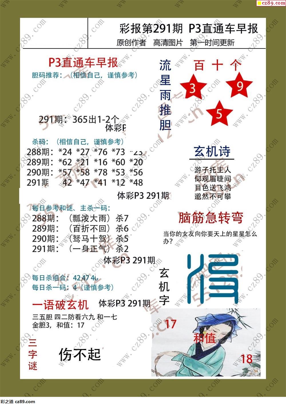 直通车早版291期体彩p3图谜